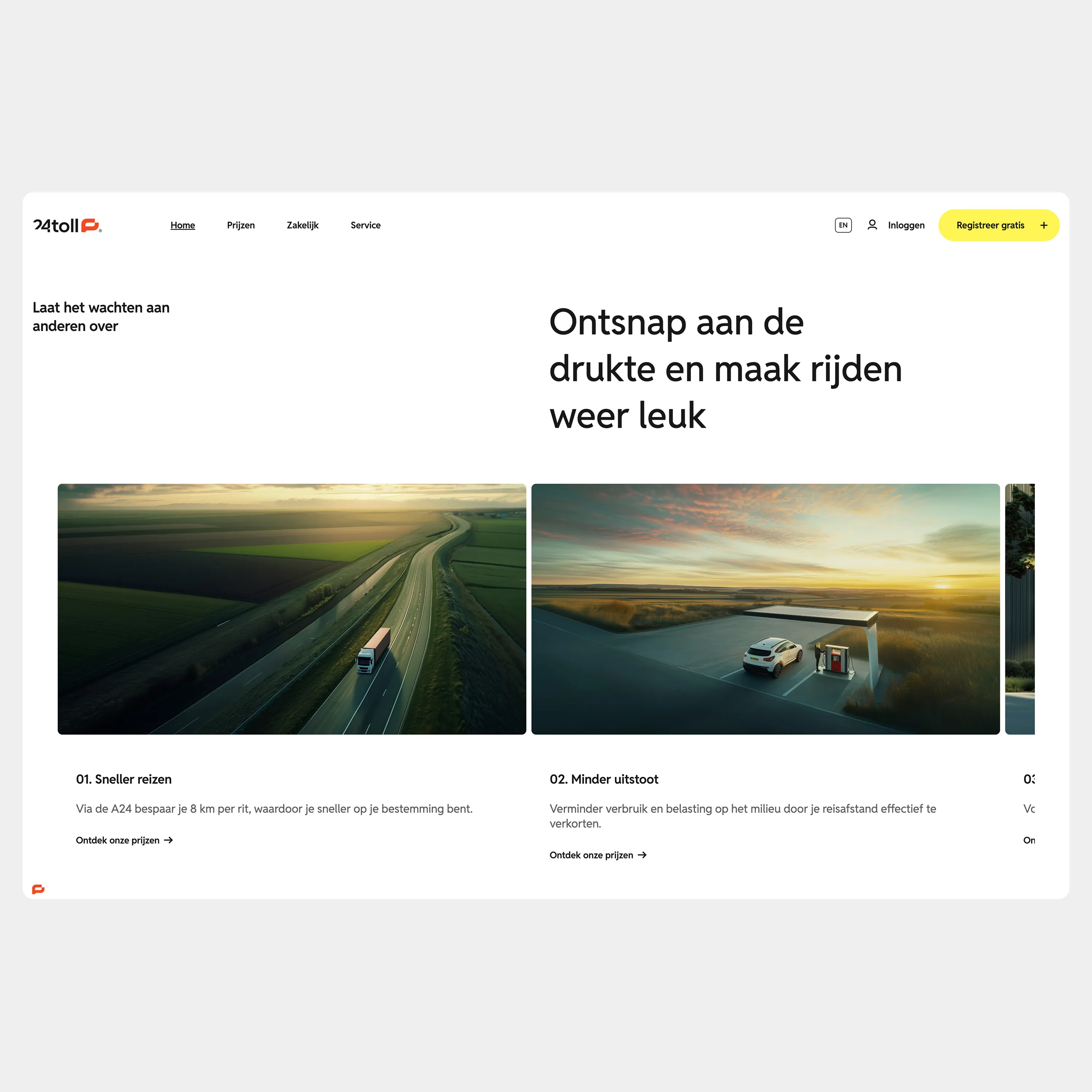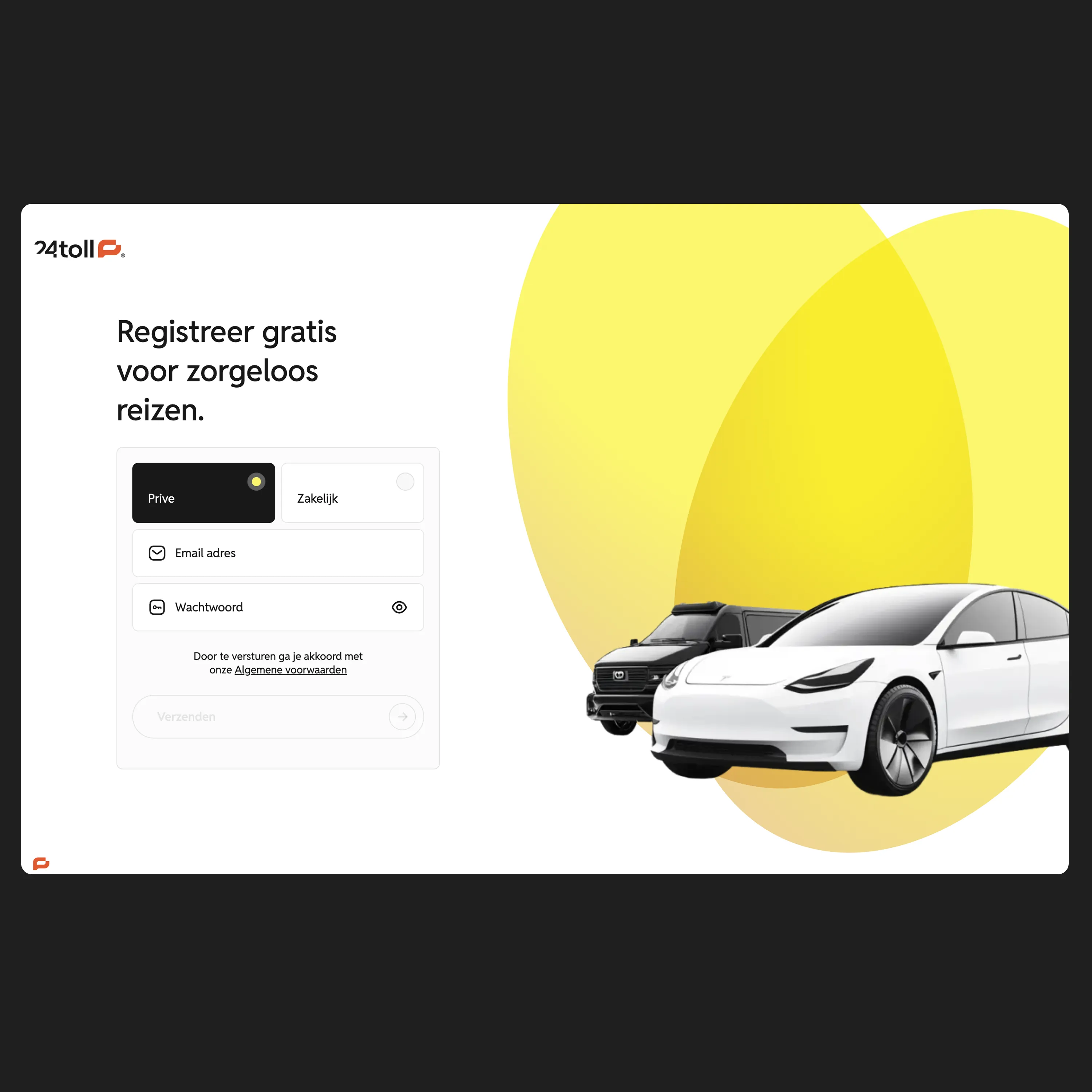 Bij het ontwerp van 24toll stond één principe centraal: frictieloos registreren. Een helder, intuïtief proces dat bestuurders zonder nadenken door de aankoop van hun e-toll vignette leidt. Tegelijkertijd moest het platform direct vertrouwen en autoriteit uitstralen, van visuele identiteit tot micro-interacties. Het resultaat is een snelle, duidelijke en betrouwbare ervaring die voelt alsof het altijd al zo had moeten werken.